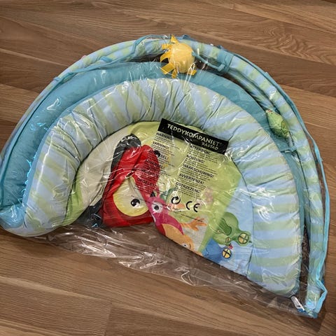 Teddykompaniet Diinglisar babygym i grått. Rund mjuk lekmatta med vadderade kanter och två bågar med hängande mjuka figurer. Passar för spädbarn som vill ligga och titta, känna och greppa leksaker. Kan användas på golv inomhus som en trygg och avgränsad lek- och viloplats för baby.