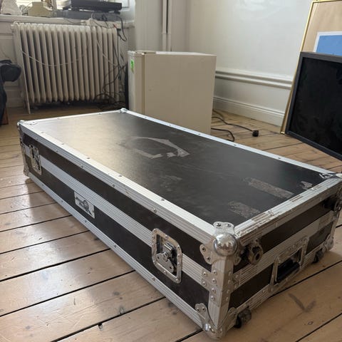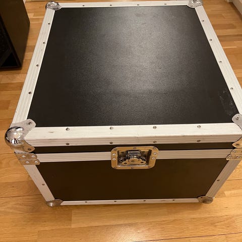 Flightcase transportlåda i svart med aluminiumprofiler och metallhörn. Utrustad med handtag på kortsidan och låsbara spännen. Invändigt vadderad med skum för skydd av utrustning under transport och förvaring. Monterad på hjul för enklare förflyttning i exempelvis studio, scenmiljö eller vid event.