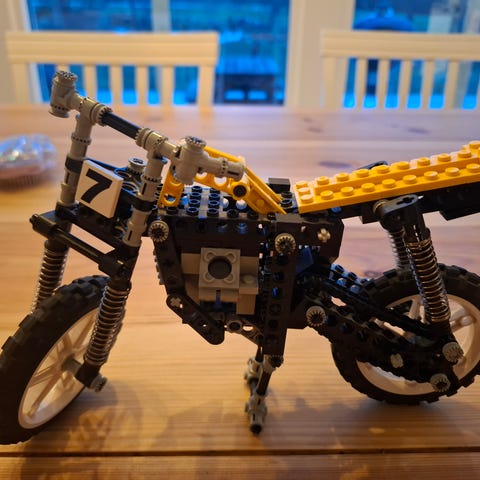 LEGO Technic motorcykel i blå och svarta färger med detaljer som stora hjul, styrhandtag, vindruta och sidoväskor baktill. Modellen är uppbyggd av teknikelement med synliga kuggar och rörliga delar, typisk för Technic-serien. Passar för bygglek, utställning eller som del i en större LEGO Technic-samling.