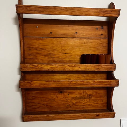 Tallrikshylla vägghängd i naturfärgat trä. Hyllan har två vågräta ribbor för uppställning av tallrikar eller andra föremål samt en övre hyllplan med profilerad kant. Sidorna är formade med dekorativt utskurna kanter. Passar för förvaring och exponering i kök, matsal eller andra rum där väggförvaring önskas. Köpt på auktion i Oslo för ca 20 år sedan.