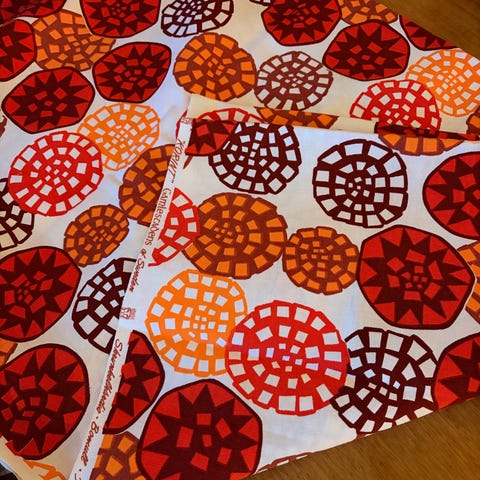 2 st skira gardinlängder med röda sirliga blommor mot vit botten.
