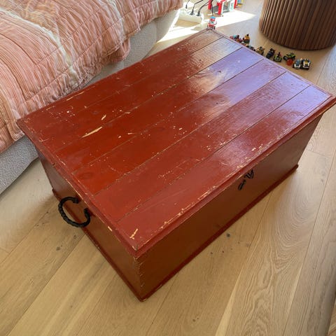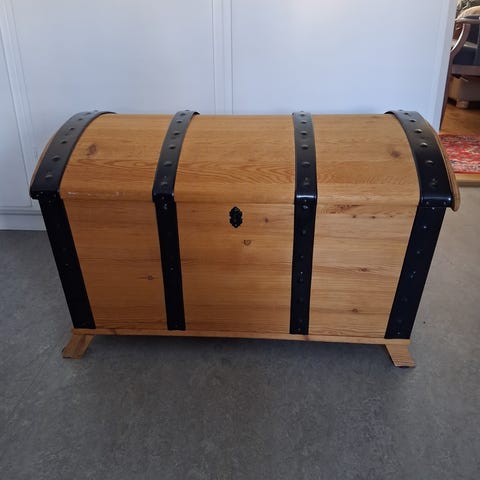 Gammal kista av träspån som kan användas till t ex att förvara textilier eller tvätt eller vadsomhelst som inte är jättetungt.
