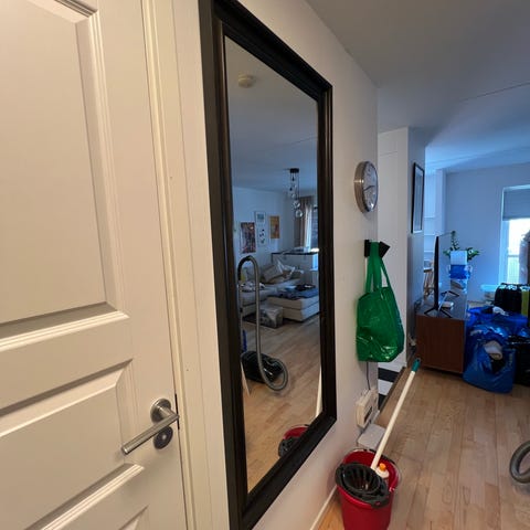 Jysk spegel med svart ram. Rektangulär helkroppsspegel som kan användas stående eller liggandes mot vägg eller monterad på vägg i till exempel hall, sovrum eller vardagsrum. Svart, markerad ram som ramar in spegelglaset och ger en tydlig kant mot väggen.