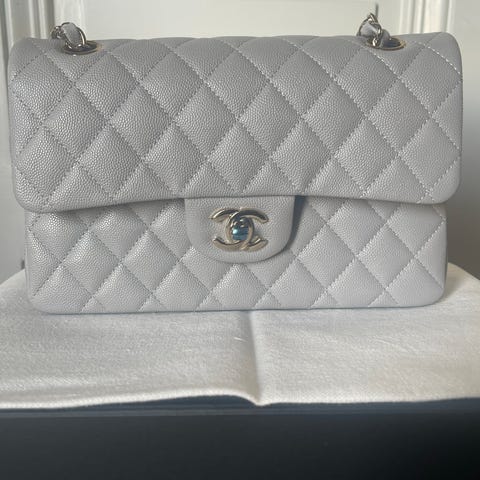 Chanel axelremsväska för kvinna i quiltat läder i grå färg. Väskan har klassisk klaff med vridlås framtill och kedjerem med läderdetaljer för bärning över axeln eller crossbody. Väskan har flera fack som anas på bild. Levereras med originalkartong och tillhörande innerförpackning enligt bilderna. Obs väskan är oanvänd, inköpt i Monaco och kvitto finns ej då det var en present. Äkthet kan verifieras av Chanel.