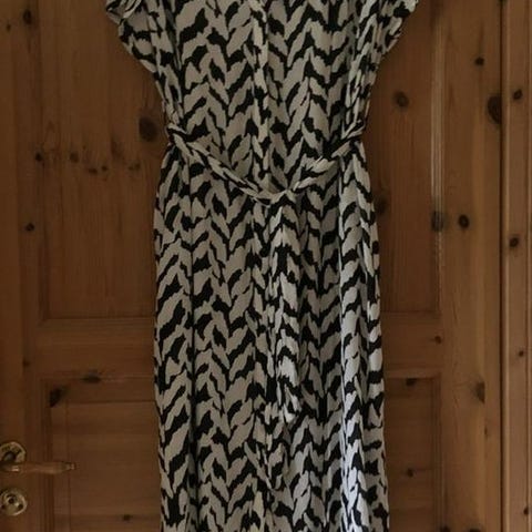 Svart klänning med vita prickar. Klänningen har en krage och knappar framtill, samt ett knytband i midjan. Den har korta ärmar.