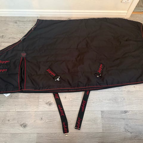 Ofodrat regntäcke i storlek 135. Använd endast fåtal ggr då min ponny är för bred över bogen. Kryssgjordar, svansrem och benremmar.