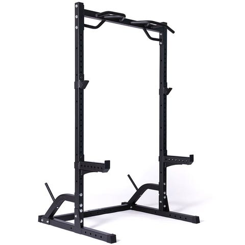 Power rack med kabeldrag i svart metall för styrketräning i hemmagym. Ställningen har justerbara säkerhetsstänger och hål för olika höjdinställningar, vilket gör den lämplig för övningar som knäböj, bänkpress och marklyft. Ovanpå finns grepp för chins och pull-ups. Kabeldraget baktill kan användas för dragövningar för biceps, triceps och rodd samt latsdrag.