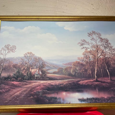 Edvard Bergh tavla med svenskt landskapsmotiv i färg, inramad med dekorativ träram och namnskylt på ramen. Motiv med träd, betande kor och stig i naturmiljö.