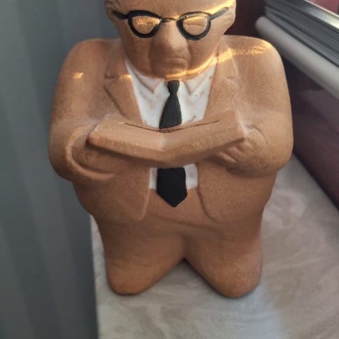 Lisa Larssons berömda sparbössa med förre finansminister Gunnar Sträng.