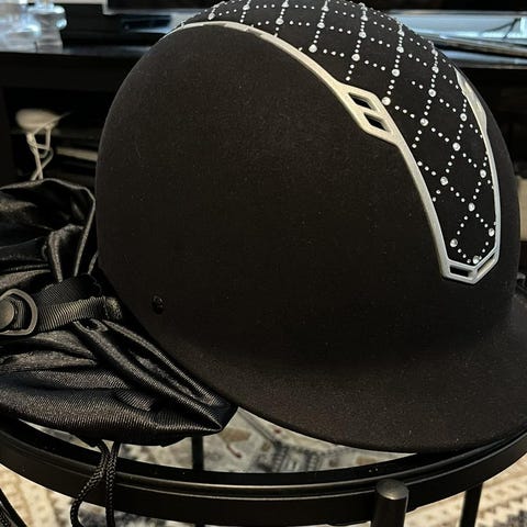 Svart ridhjälm från CRW strl 53-54. Justerbar. Mycket fint skick. Glitter på ovansidan. Finns i Björkhagen.
