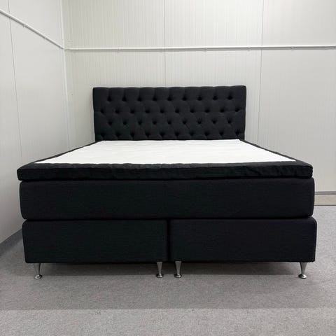Mio kontinentalsäng i grått tyg med matchande, knapptuftad sänggavel. Sängen består av två underdelar med metallben och en övre madrassdel. Klädseln är i ljusgrå textil och sängen har en rak, modern design. Passar som dubbelsäng i sovrum. Exakt mått och fasthet framgår inte av uppgifterna och kan behöva mätas eller kontrolleras vid behov.