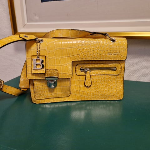 Mulberry axelremsväska i läder för kvinna. Väskan har präglad läderyta med krokodilmönster och en rektangulär form. Den stängs med ett klassiskt vridlås i metall på framsidan. Baksidan har ett ytterfack med dragkedja. Insidan rymmer mindre personliga tillhörigheter och har fack för exempelvis kort. Väskan bärs med en kedjerem i metall som kan användas över axeln eller tvärs över kroppen.