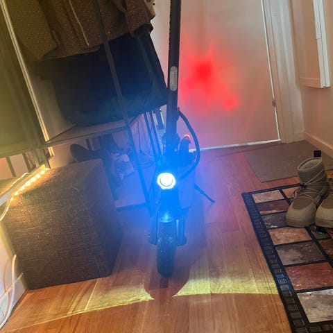 Kugoo kirin (kukirin) el-scooter i svart färg. Modellen har ståplatta, styre med handtag och display samt fram- och bakbelysning med vita och röda lampor samt gula sidoljus. Med blinkers. Utrustad med mindre hjul anpassade för stadskörning. El-scootern är avsedd för en person och körs stående.