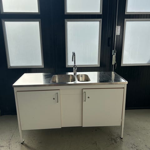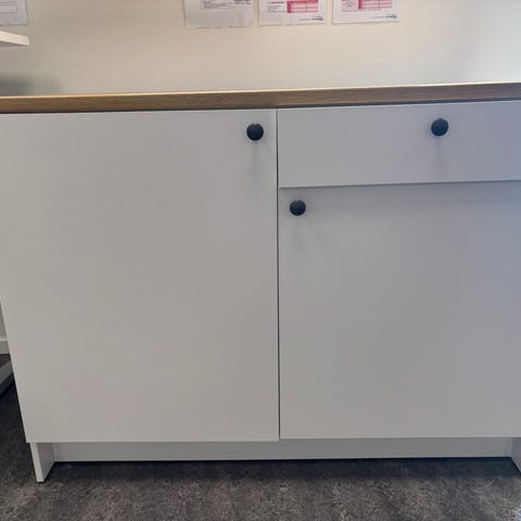 Arbetsbänk i slitstark laminat, underrede i metall och underskåp med hyllor. Passar som arbetsbänk eller förvaringsbänk.