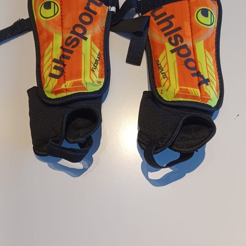 Uhlsport benskydd i svart med gröna detaljer. Modell med hårt skal på utsidan och vadderad insida för stötupptagning. Utrustade med resårband och kardborre för att kunna fästas runt underbenet. Avsedda för användning vid fotboll eller liknande bollsporter där skydd för smalbenen behövs.