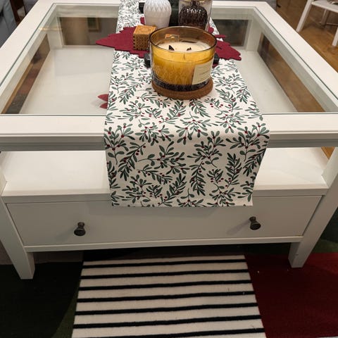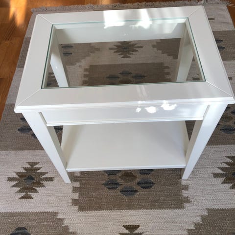 Soffbord i trä med rektangulär glasskiva. Bordet är vitt och har svarvade ben samt en nedre hylla för extra avlastning eller förvaring. Passar som soffbord i vardagsrum eller som sidobord i andra rum där man önskar en kombination av trä och glas i ljus färgton.