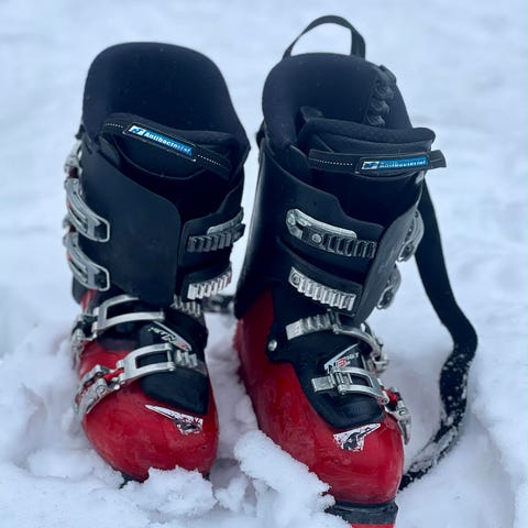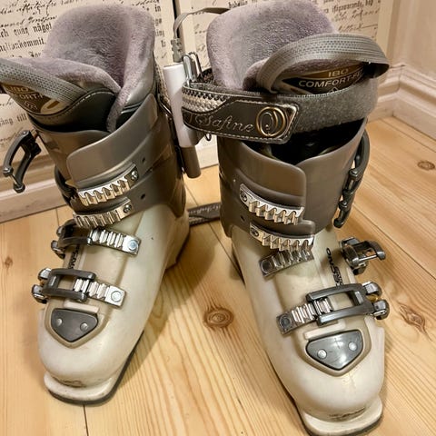 Tecno Pro Maxum pjäxor i grå färg. Modellen har fyra justerbara spännen framtill samt kardborreband upptill för stabil passform runt fot och underben. Pjäxorna har vadderad, grå innersko för ökad komfort. Yttersulan är mönstrad för bättre grepp vid gång. Storlek ca 37.