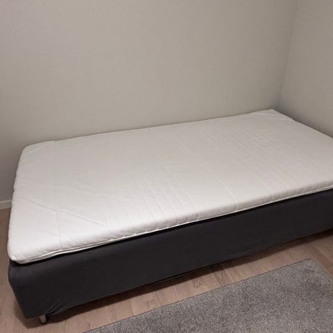 Kontinentalsäng från Jysk 140x200cm. Original-bäddmadrass (undre) som ger stöd + tillköpt memoryfoam-madrass (nypris 3000kr) medföljer. I gott och fräscht skick.