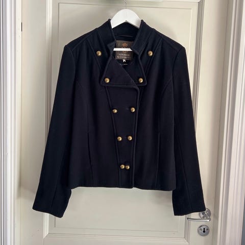 Sisters Point jacka för dam i storlek XS. Jackan är svart och tillverkad i bomull. Modellen har ståkrage, dubbelradiga dekorativa knappar framtill och två ficklock. Passar som vardags- eller festjacka beroende på övrig klädsel.