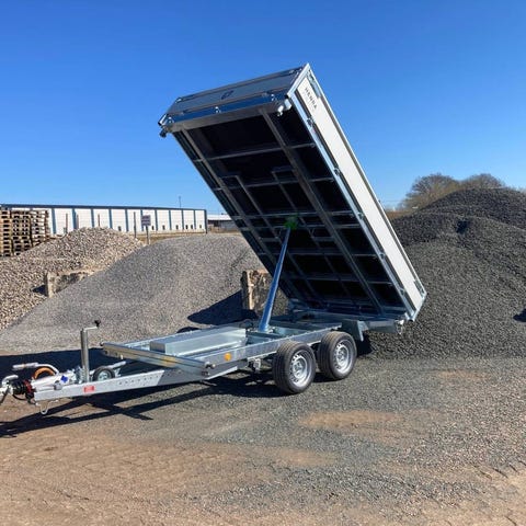 Extra kraftig enkelaxlad släpvagn med elektrisk + manuell hydraulisk tipp