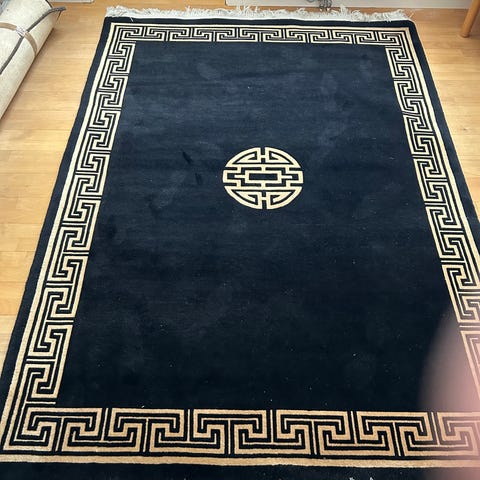 Rund matta från Garda Rug Company säljes. Svart matta med beige dekorativt mönster som passar fint i hall, under mindre bord eller som accentmatta i hemmet.