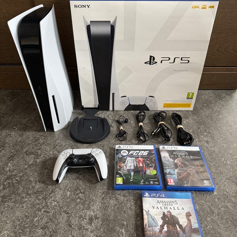 Sony PlayStation 5 spelkonsol med två DualSense-handkontroller i färgerna vit och blå. Konsolen är en stationär spelkonsol avsedd för TV-anslutning. Paketet inkluderar originalkartong samt dokumentation enligt bild. Lämplig för användning med kompatibla PS5-spel och tillbehör.