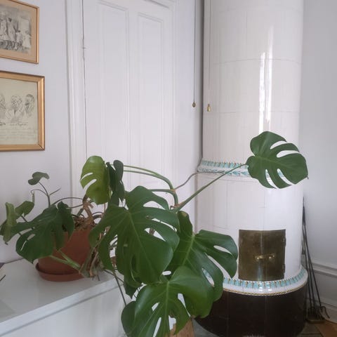 Monstera krukväxt i grön färg. Växten har stora, hjärtformade blad och trivs inomhus i ljusa rum utan direkt stark sol. Placeras i kruka med väldränerad jord och vattnas regelbundet när jorden torkat lätt på ytan. Passar som dekorativ grön växt i hem, kontor eller andra inomhusmiljöer.