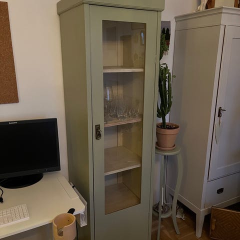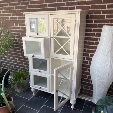 Klassiskt vitrinskåp i engelsk antik stil med elegant spröjs. Varsamt handmålad i Jotun ’Sand’ och med insidan i varmvit. Flyttbara hyllplan och ny belysning. Nycklar finns.