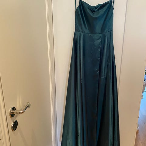 Mango festklänning för dam i storlek S. Klänningen är grön och tillverkad i satinliknande material. Modellen har tunna axelband och draperad överdel med längre, rak kjol. Passar till fest och andra mer uppklädda tillfällen.