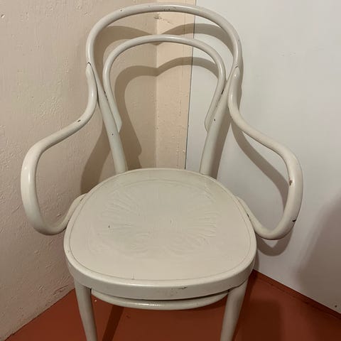 10 stk vita matsalsstolar med detaljer i rotting. Sittdynor följer med.