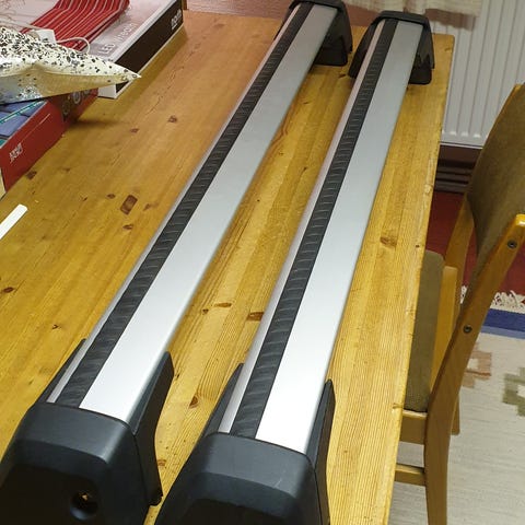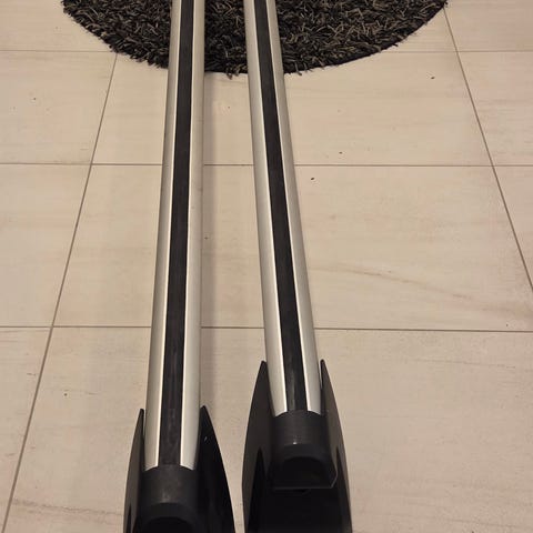 Mercedes-Benz takräcken i aluminium. Setet består av två tvärbalkar med svarta plastfästen. Takräckena är avsedda för montering på bilens takrails och kan användas som bas för exempelvis takbox eller annan last på taket. Tillverkade i aluminium med plastdetaljer, enligt märkning på produkten.