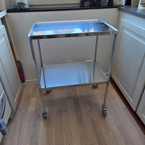 Rostfritt 40 ggr 60cm, 2 hyllplan, låsbara hjul, plastlåda, märke LOJER, nypris ca 5000kr
