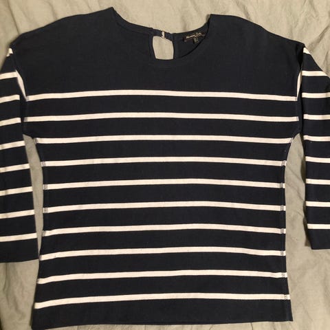 Tommy Hilfiger tröja för dam i storlek M. Tröjan är blå med mörka ränder och har V-ringning. Tillverkad i akryl med ribbstickad struktur. Långärmad modell som passar för vardagsbruk.
