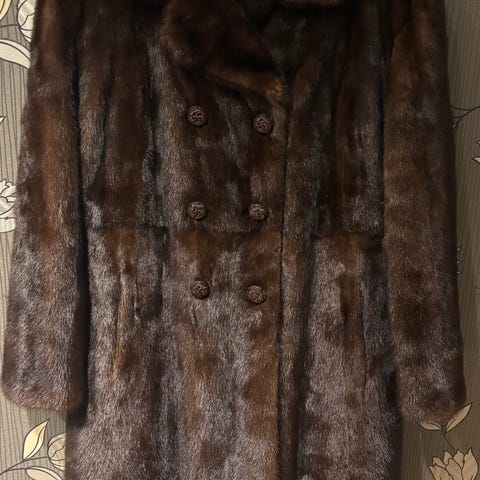 Pälsen är brun och tillverkad i mink. Modellen är knälång med lång ärm och enkel knäppning framtill. Passar som ytterplagg under kallare årstider.