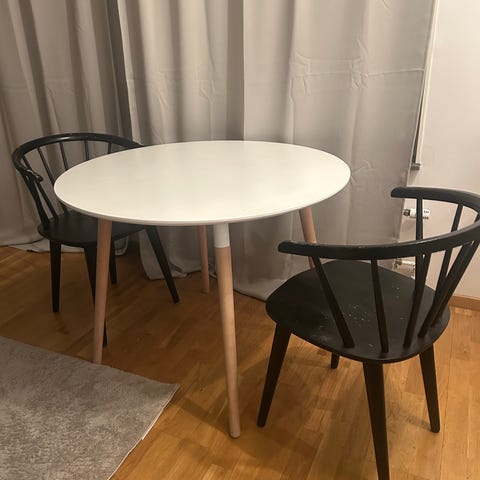 Säljer ett matbord (diameter 65cm, höjd 75cm) och två svarta matstolar.