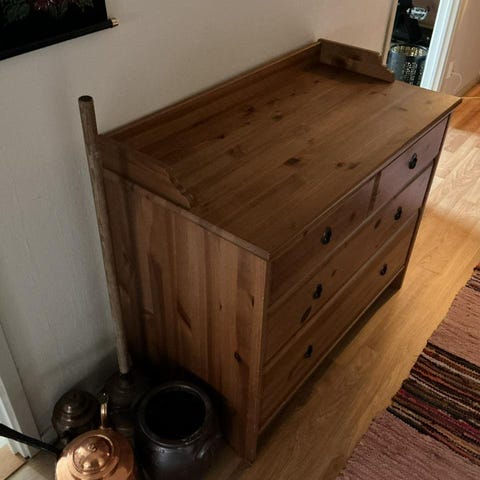 Sekretär med utdragbar hylla. Möbeln har rullucka upptill som öppnas till en arbetsyta med småfack och lådor. Nyckel finns till rullucka och översta lådan. Nedtill finns flera större lådor med runda beslag för extra förvaringsutrymme. Passar som skrivplats och förvaring i vardagsrum, sovrum eller arbetsrum.