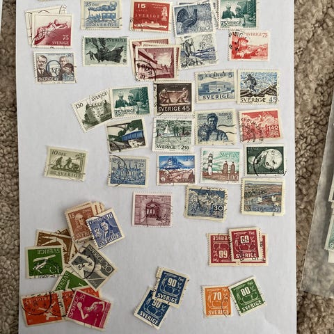 Sverige frimärken i blandade häften och block. Flera olika motiv, valörer och färger, bland annat blå, röda, gröna och bruna frimärken. Innehåller både hela häften med flera sammanhängande frimärken och mindre block/kvartetter. Lämpligt för frimärkssamling eller komplettering av befintlig samling.