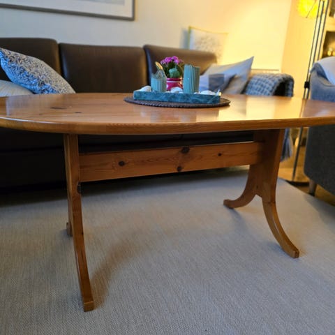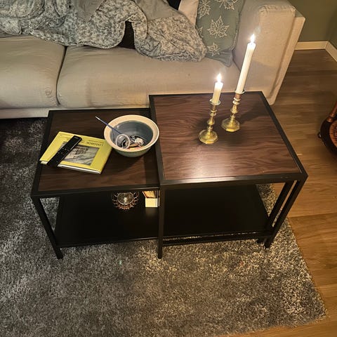 Soffbord med klaffar och rektangulär bordsskiva i trä. Bordet har svart underrede med raka ben, en låda med handtag samt en hylla under för extra förvaring. Klaffarna på sidorna kan fällas upp eller ner för att justera bordets storlek efter behov. Från 50 cm, till två klaffar 44 cm vardera. Passar som soffbord eller sidobord i vardagsrum.