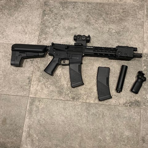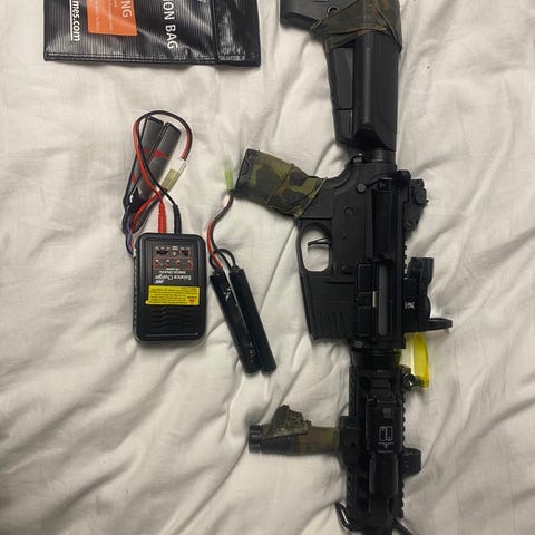 Nu säljer jag mitt airsoft gevär med laddare samt en peq-15 laser, ett foregrip och 4 magasin som är begagnade, 3 utav 4 magasin fungerar som de ska, ett magasin är det fel på kanske fjädern, peq lasern har en spricka på undersidan