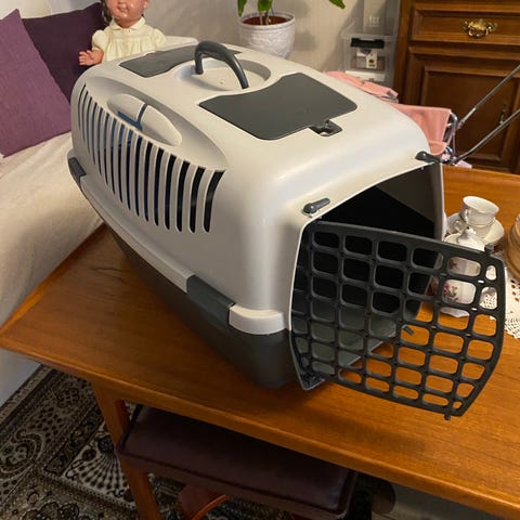 Transportbur för katt eller liten hund i hårdplast. Övre del i vit plast och nedre del i svart plast. Gallerdörr framtill i metall som kan öppnas och stängas med spärrar. Ventilationsöppningar på sidorna och ovansidan. Buren har bärhandtag på toppen och kan användas för transport till exempelvis veterinärbesök eller resor. Invändigt ligger en filt med tassmönster som ger ett mjukare underlag för djuret.