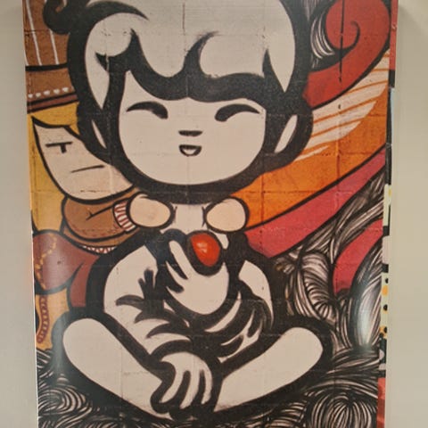 Målning i akryl på duk av Maria Larsdotter, signerad med initialerna "MLA" i nedre högra hörnet. Motivet föreställer en stiliserad, svart katt mot en gul och mörk bakgrund med grafiska detaljer i vitt, rött och turkos. Verket är målat på uppspänd duk med målade kanter, vilket gör att det kan hängas direkt på väggen utan ram. Passar som väggdekoration i exempelvis vardagsrum, hall eller kontor. Exakta mått :60x60cm