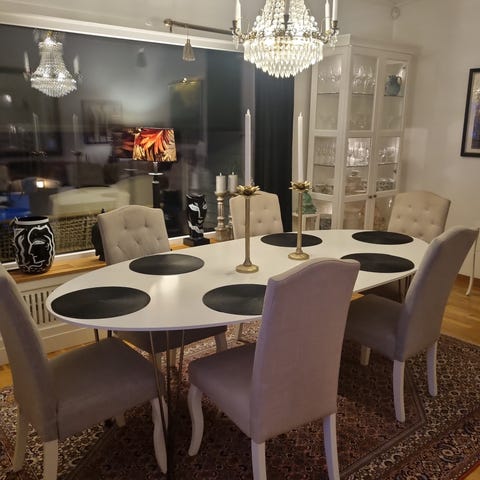 Härligt rymligt matbord i mangoträ med vaxad rustik yta och underrede i pulverlackat stål. Sex stoppade matstolar från Mio - allt från 2021. Nypris bord 5 795, stolar 2 195/st. Finns även rund matchande gråtonad matta till matgruppen om intressant.