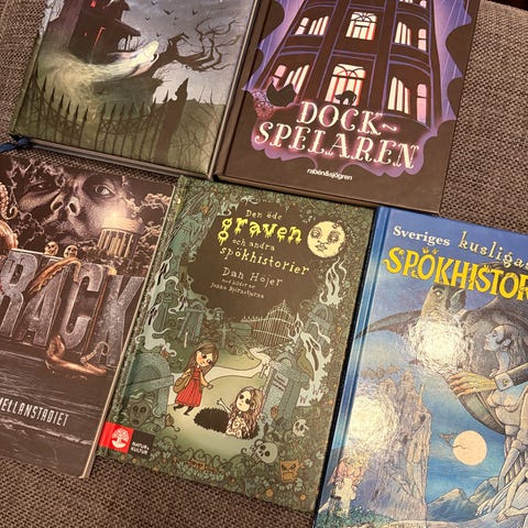 Paket med blandade barn- och ungdomsböcker inom främst skräck, fantasy och äventyr. I samlingen ingår bland annat titlar som "Creepy – skrik i natten", "Creepy – flickan", "The 78-storey treehouse" samt "Death Note Black Edition". Böckerna är i blandade format, både inbundna och pocket. Lämpliga för läsare i mellanåldern och uppåt som är intresserade av spänning, skräck och humoristiska äventyr. Passar för egen läsning eller som högläsning beroende på ålder och läsvana.