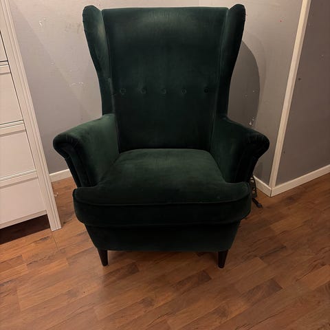 Strandmon öronlappsfåtölj, djuparp mörkgrön. En modell som enligt ikea utgår inom kort.
