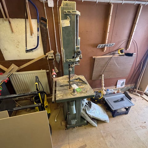 Kity 612 bandsåg med tillhörande spånsug. Bandsågen står på ett stabilt trästativ och har metallbord för sågning av trä och andra material. Sågen drivs av elmotor 3-fas placerad i stativet. Spånsugen är utrustad med uppsamlingssäck och slangar för anslutning till maskinen, avsedd för uppsamling av spån och damm i verkstadsmiljö. Lämplig för snickeriarbeten som kapning och formning av trädetaljer i hobby- eller mindre proffsverkstad. Ingår också en mindre 230v Black o Decker bandsåg 230v. Allt fungerar och flera bandsågsblad ingår till Kity 612.