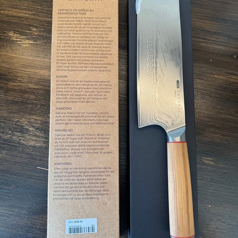Yaxell super Gou 165mm Kockkniv kökskniv vass men synligt använd. Nypris 5099:- Santoku chefknife i original förpackning. Olivslipad 161 lager. Bladet har en extremt vass egg som är tillverkat av det japanska rostfria pulverstålet SG2 Micro Carbide, vilket är omslutet av 160 lager mjukare stål. Det pulveriserade stålet innehåller mycket kol och har en hårdhet på ca 63 HRC.