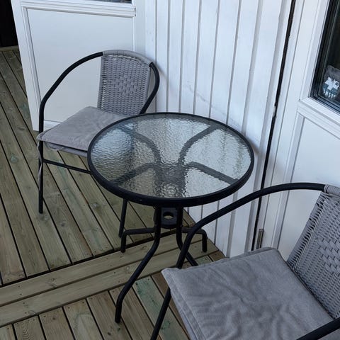 Cafégrupp med två runda balkongbord med glasbordsskiva och tre stolar. Borden har metallstativ och genomskinlig, mönstrad glasyta. Stolarna har svart metallram, två med sits och rygg i ribbad design och en med ljusa träliknande ribbor i sitsen. Passar för användning på balkong, uteplats eller mindre altan.