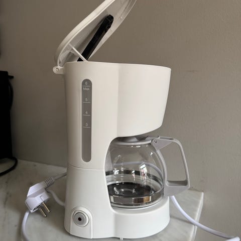 Melitta Single 5 kaffebryggare i vit och grå plast med glaskanna. Bryggaren har vattennivåindikator på sidan och av/på-knapp på framsidan. Utrustad med löstagbart filterhållare för pappersfilter.