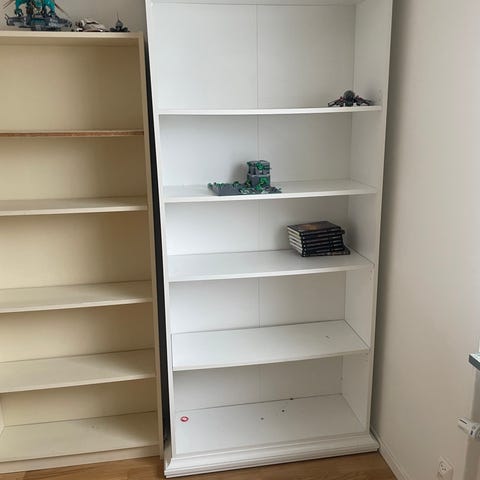 Fristående bokhylla i vit färg. Hyllan har en vertikal stomme med flera snedställda hyllplan som lämpar sig för förvaring av böcker, tidningar eller mindre föremål. Passar i vardagsrum, sovrum eller kontor där man vill utnyttja höjden för förvaring. Utförande i träbaserat material med slät, målad yta. Står på en rektangulär bottenplatta för stabilitet och placeras direkt på golvet mot vägg.