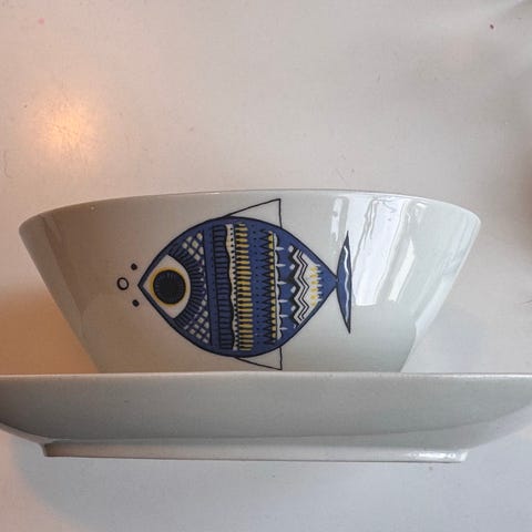 Handmålad dekor i gröna/blå toner som föreställer en stiliserad fågel omgiven av fiskar.